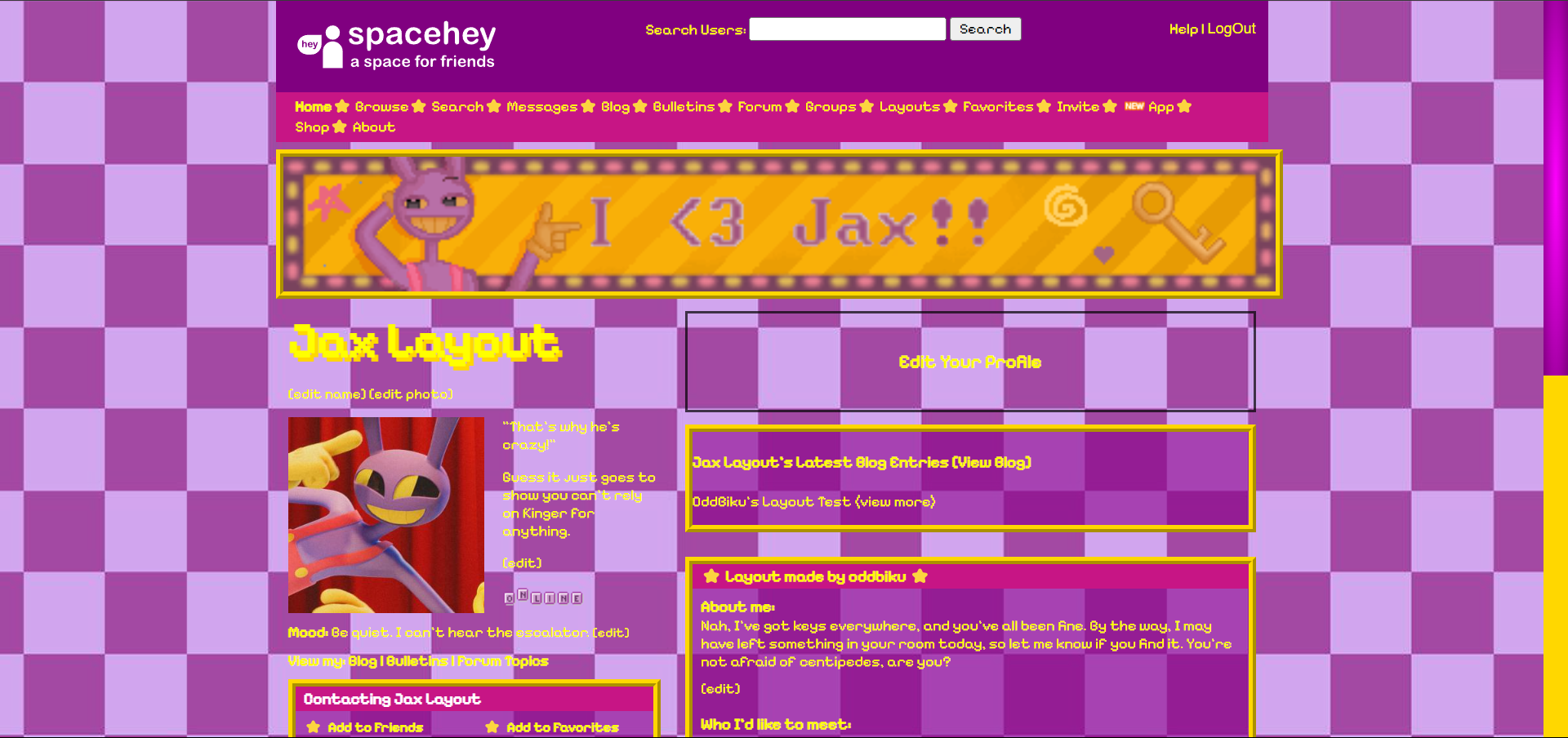 In 2024, I briefly returned to SpaceHey. I’m not sure why. I remember making my own custom layout for my website based on my old website’s layout. Alongside that, I made a custom layout based on Jax from The Amazing Digital Circus back when the show was fairly new, which in turn was based on a blinkie made by someone on Tumblr. One user had the layout, which probably remains on their profile to this day. Here’s a screenshot of the theme, made with a layout testing account I made.