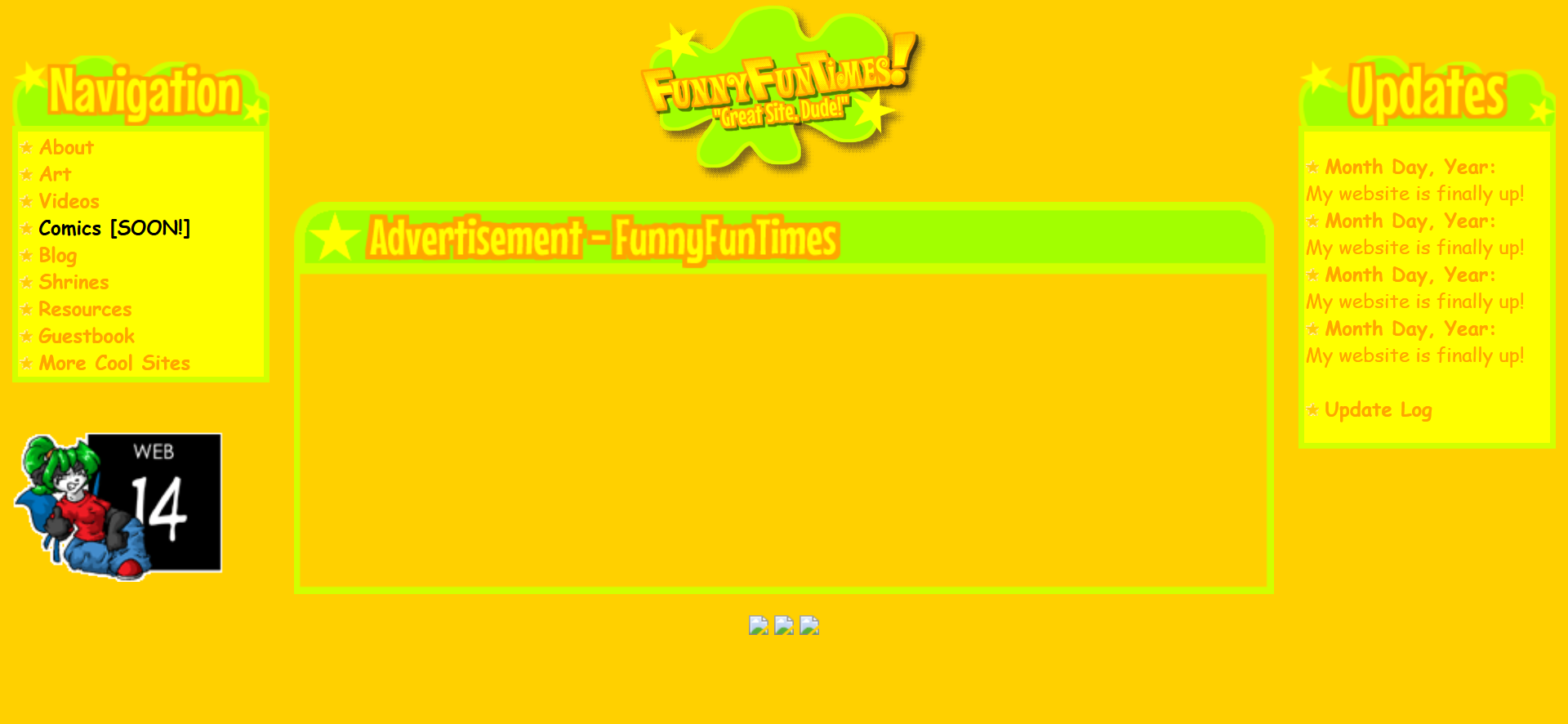 Did you know that I had another website before this one? Well, this one wasn’t publicly launched. This was the old, unused name for TakeThatMom!: FunnyFunTimes. I chose it because it was a funny phrase I liked. I didn’t know what the hell I was doing during this phase. I remember trying to not have the site hosted on Neocities in an attempt to make myself more independent, so I tried other free web hosts like InfinityFree, but I came back to Neocities, where I remain as of now. Here’s a screenshot of the only page made for FunnyFunTimes: the index.